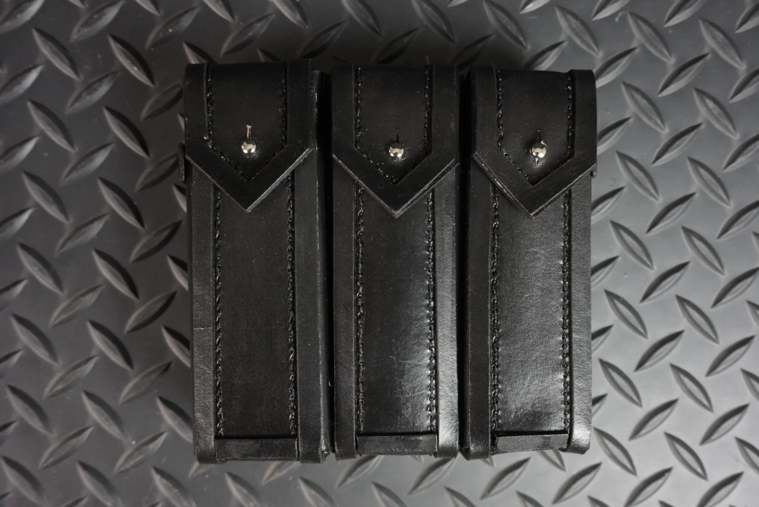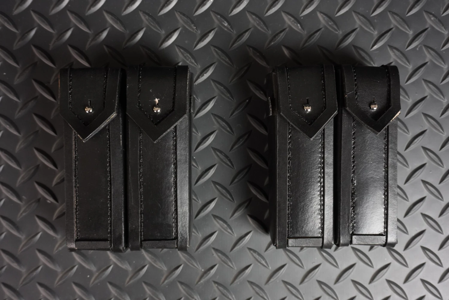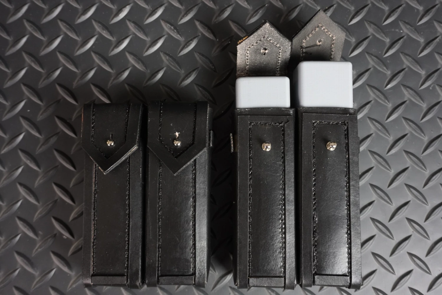 Both are hand stitched from high quality leather of various ounces ranging from 3-9oz. Dyed black and grey for accuracy but with custom color options by request.