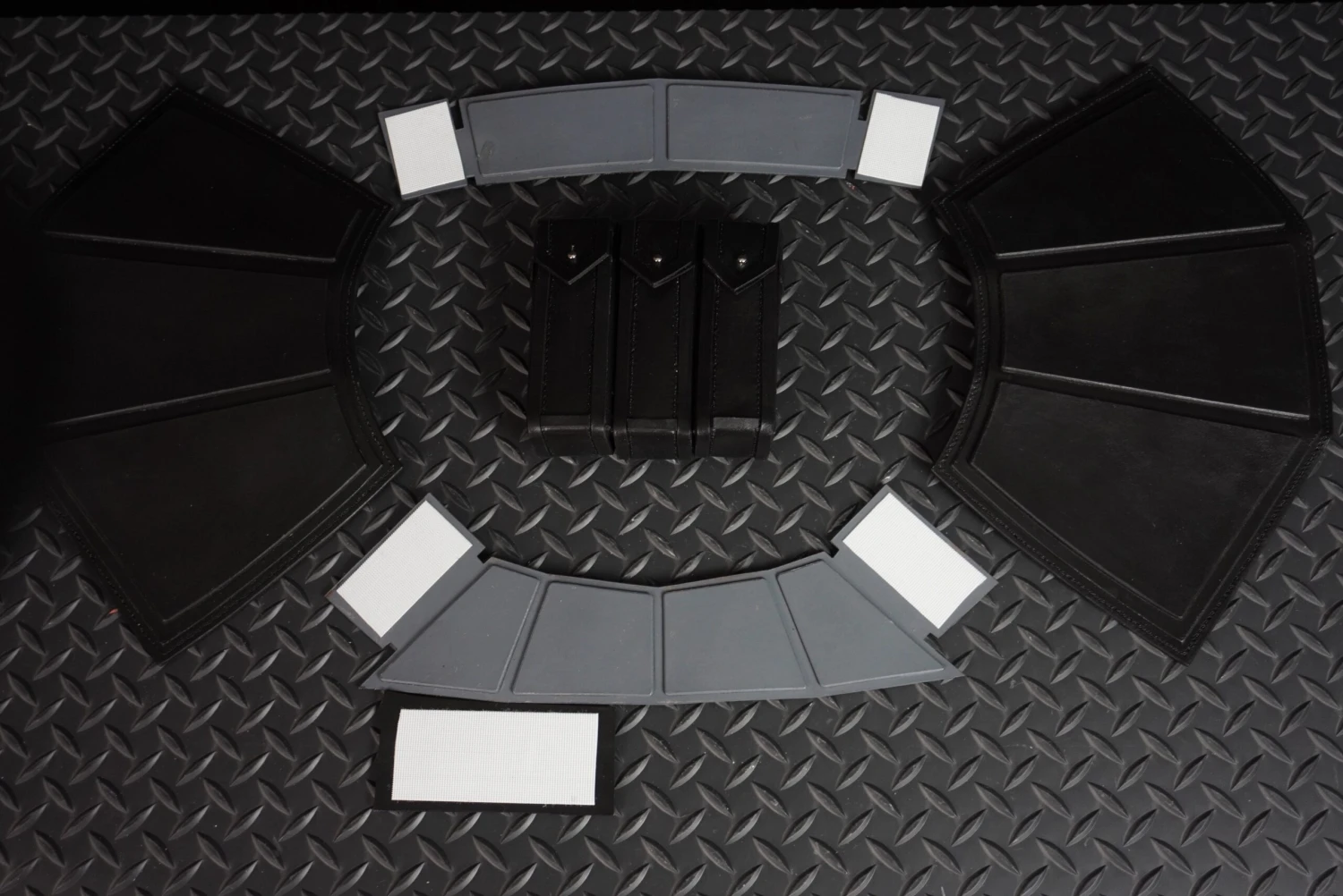 The pauldron features 4 main pieces which interlock with velcro. A 3 piece pouch attaches to the front.
