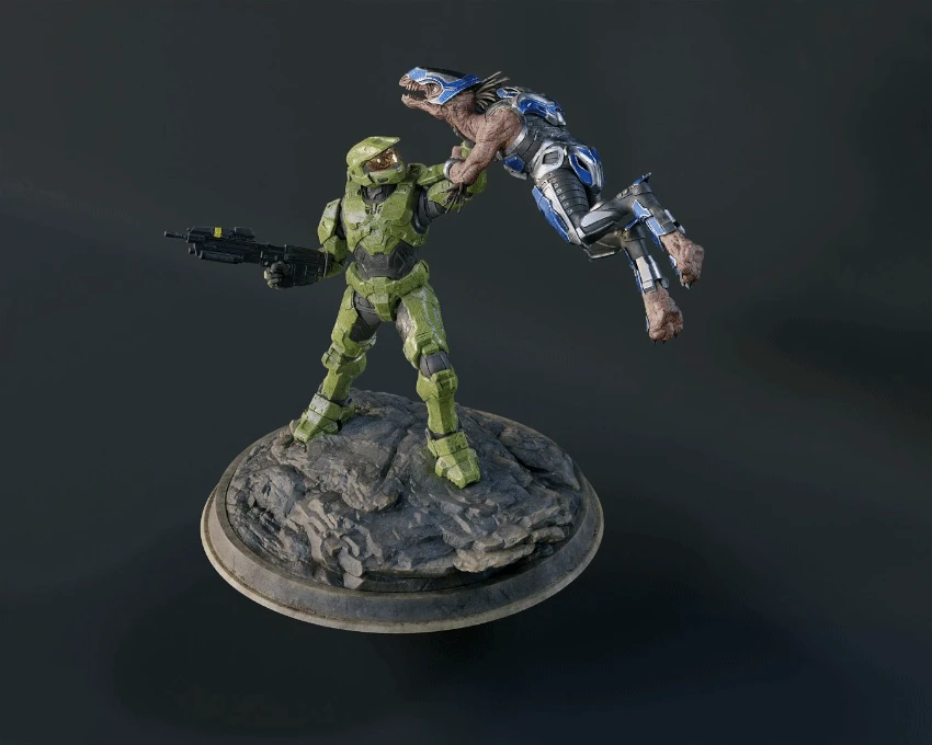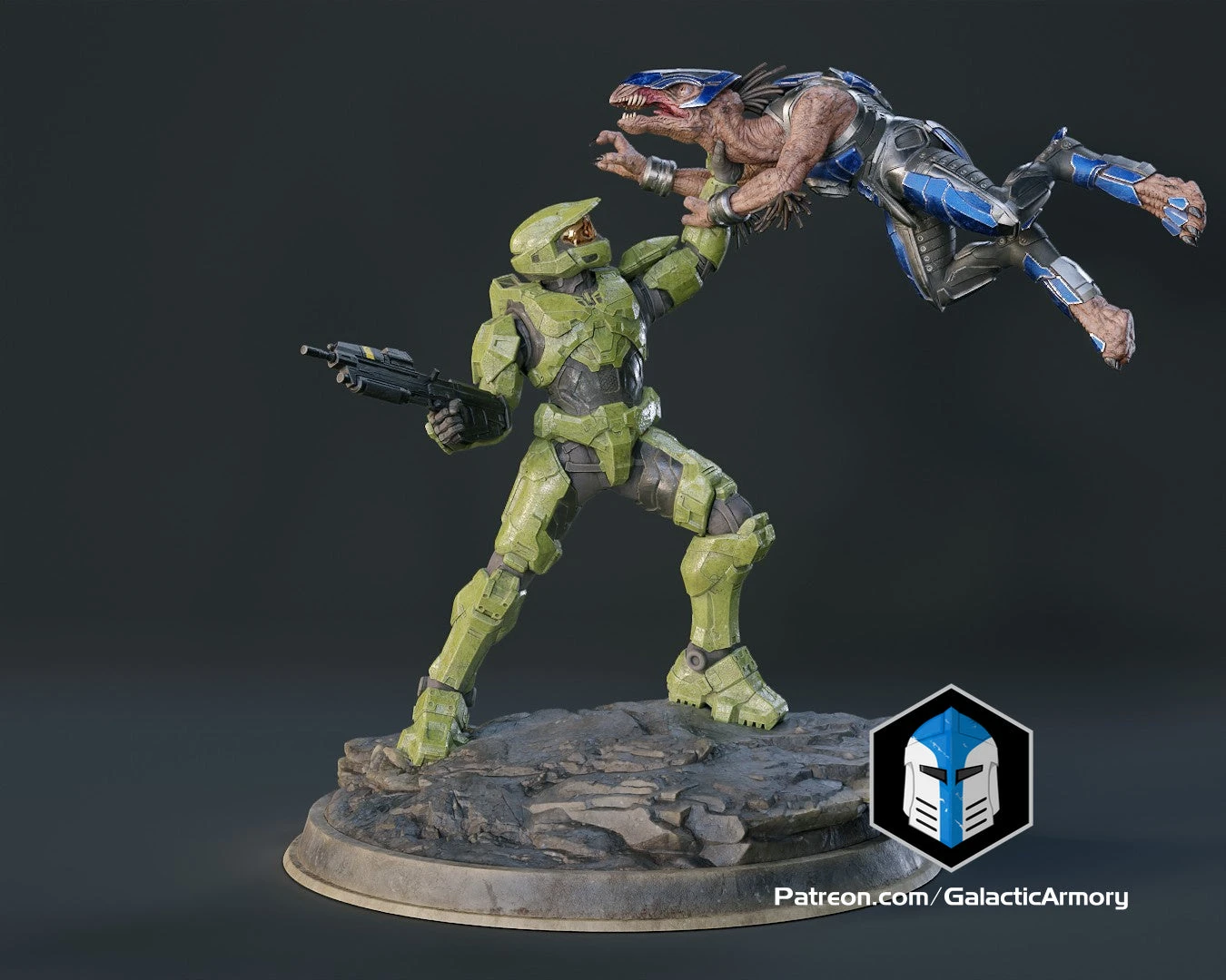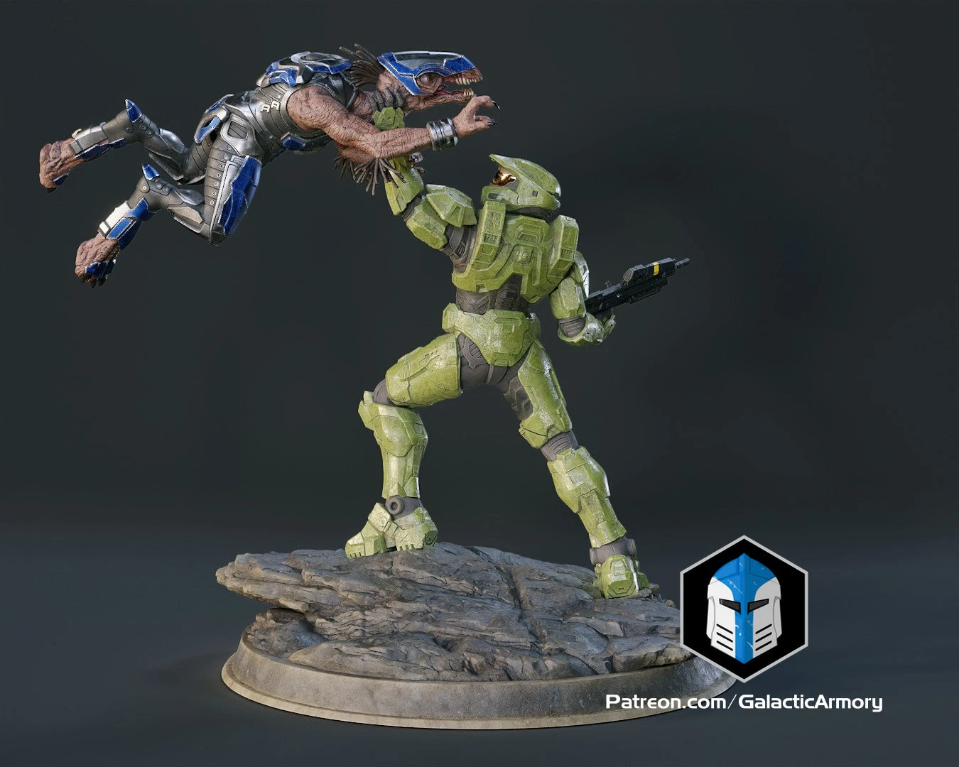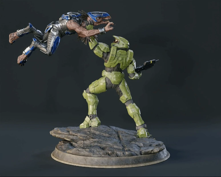 Both utilize a 2mm metal rod through Master Chief’s arm into the Jackal’s head for support.