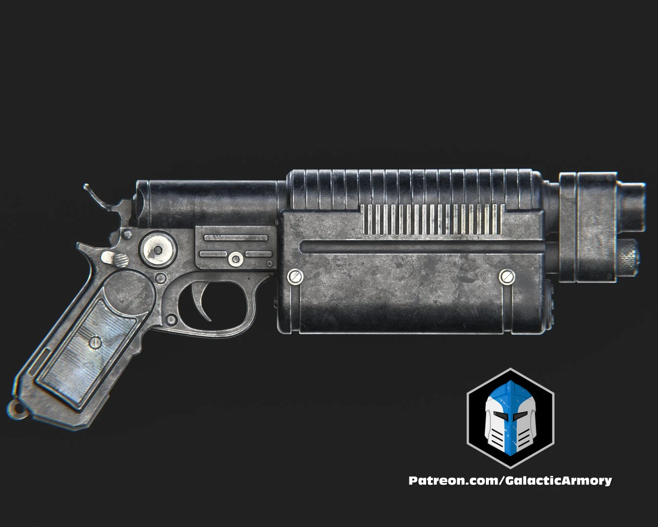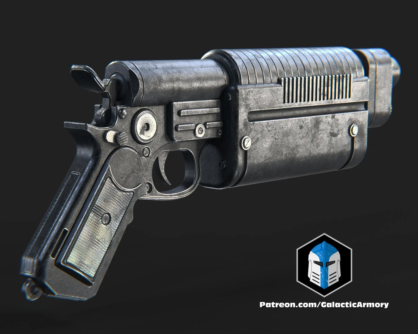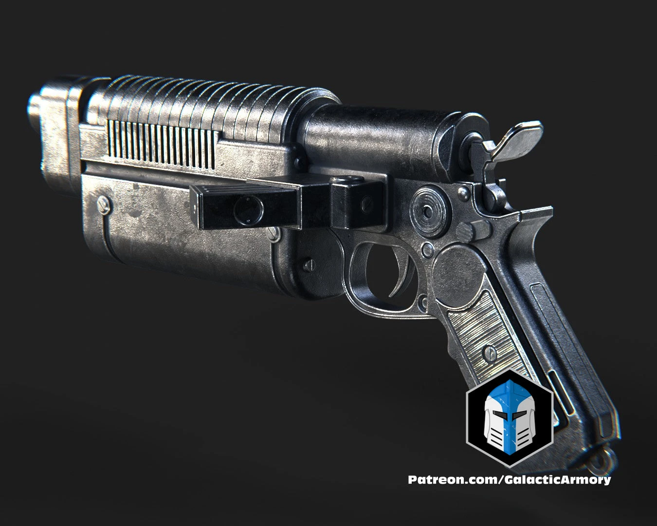 Modeled by Sergey Kolesnik with our own little twists you have 2 versions of the blaster you can print: Kyle Katarn or K-16 Bryar. Kyle Katarn’s version doesn’t have the magazine on the side like the K-17 does.