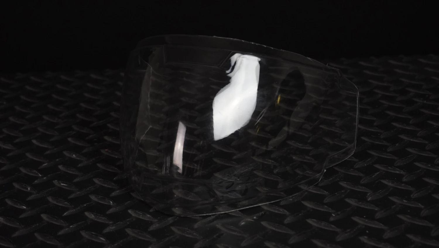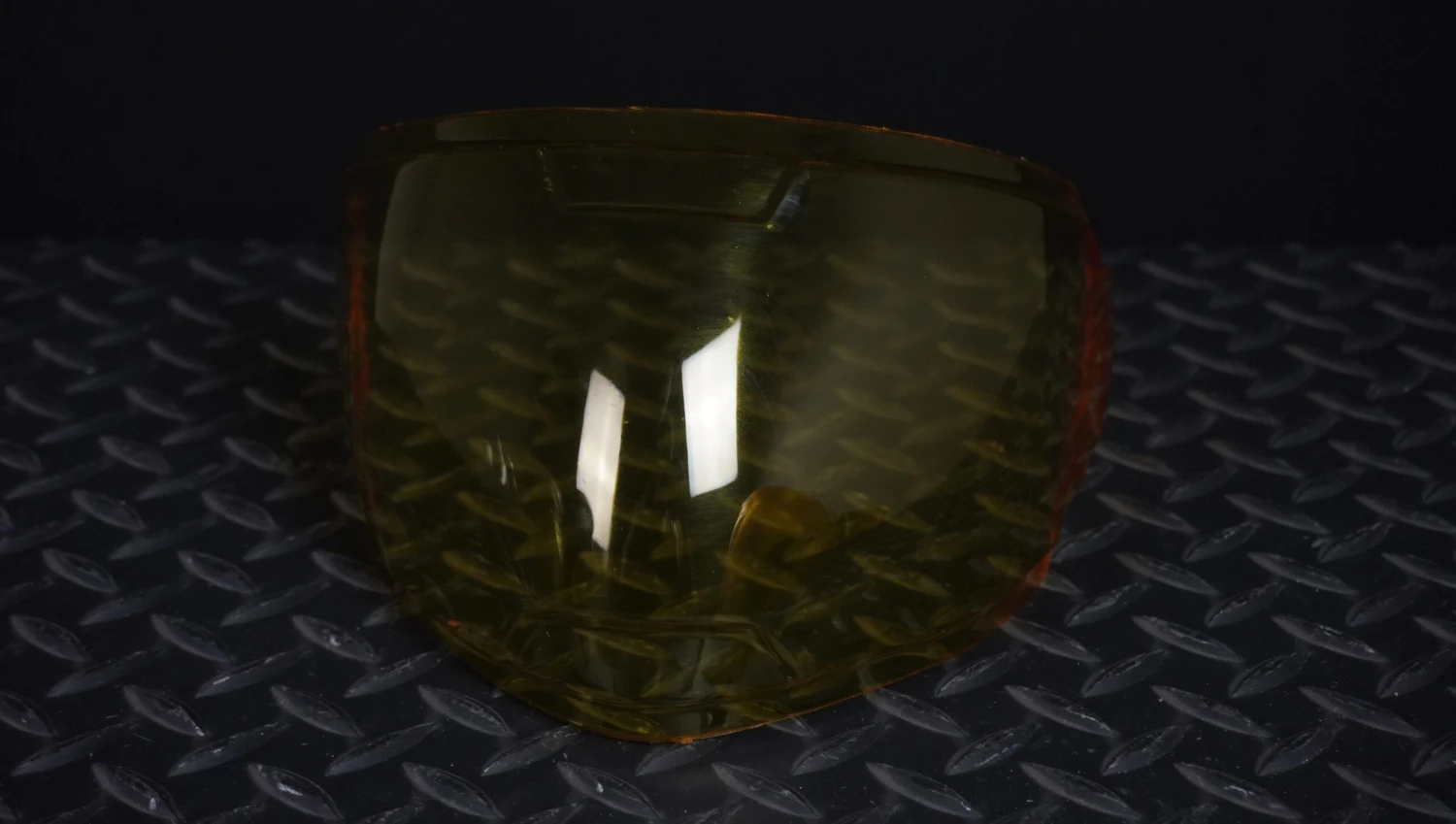 Visors are available in 3 finishes: clear, dyed, and dyed and tinted. Clear visors are raw vacuum formed visors. Dyed visors are dyed a golden yellow. Dyed and tinted visors are dyed and then tinted with a chrome paint for reflectivity.