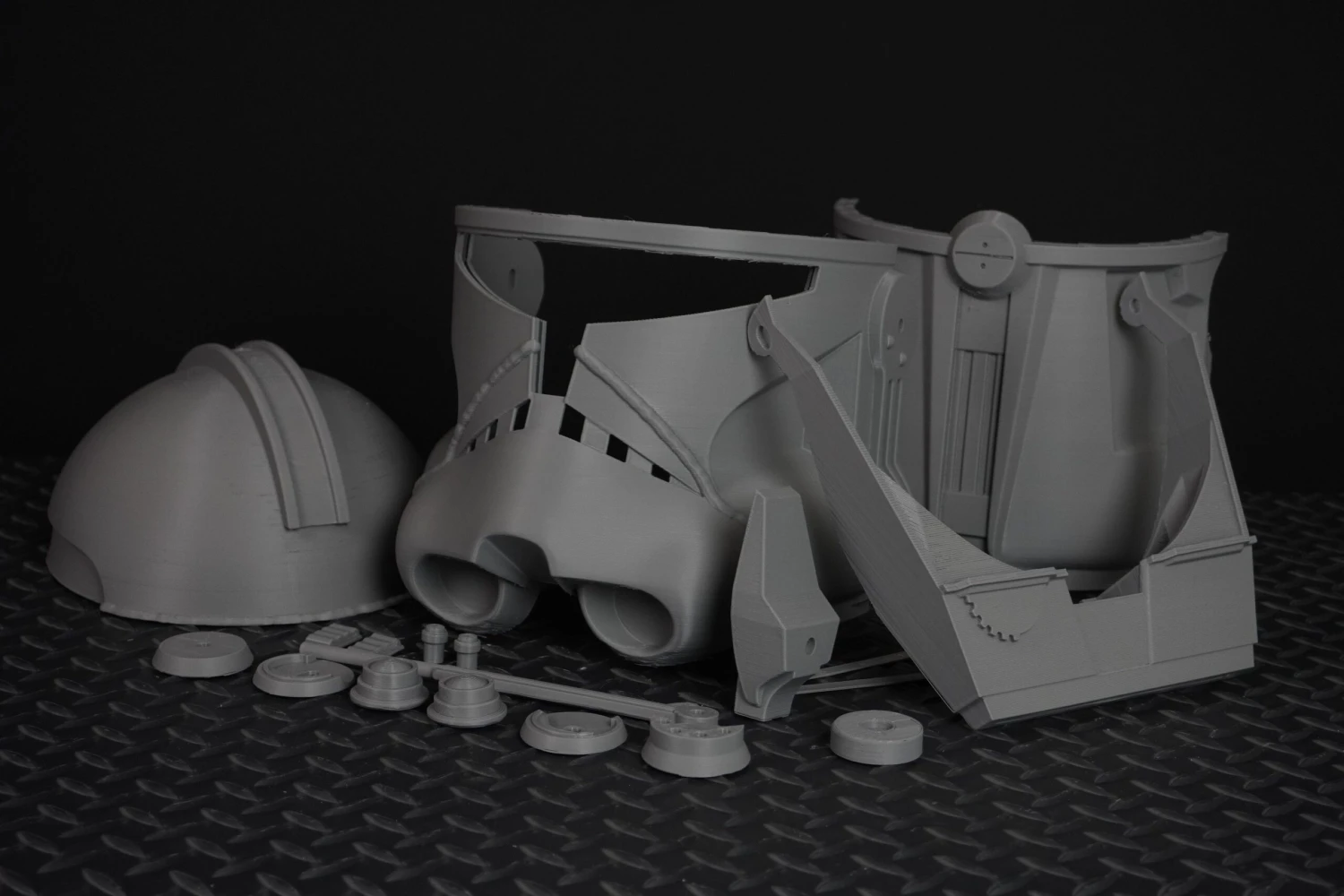 This helmet will be shipped in 3 main pieces: front, back, and top. Along with 14 detail pieces: antenna top, antenna stem, antenna base, tusks x2, aerators x2, ears x4, visor template, an extra ear cap and the mouth greeblie.