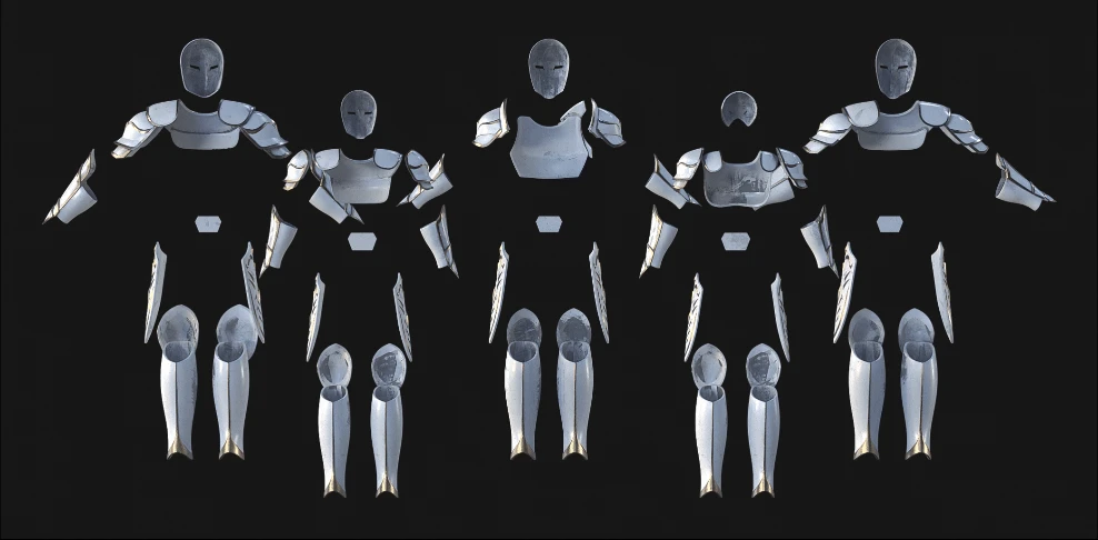 Each one includes a unique mask with some additional parts that make each set unique. There are some shared parts between sets such as the calves, hip plates, and belt buckles. The Male sets are default scaled to around 6′ tall 180 lbs. and female sets to 5’6″ 150 lbs.